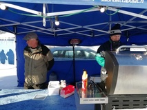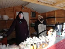 ![]() Tuula Keskitalo edessä, Anne Järvinen ja Tarja Raitis kioskin sisällä | ![]() | ![]() Makkaraa paistoivat sotilaspoikien perinneyhdistys |